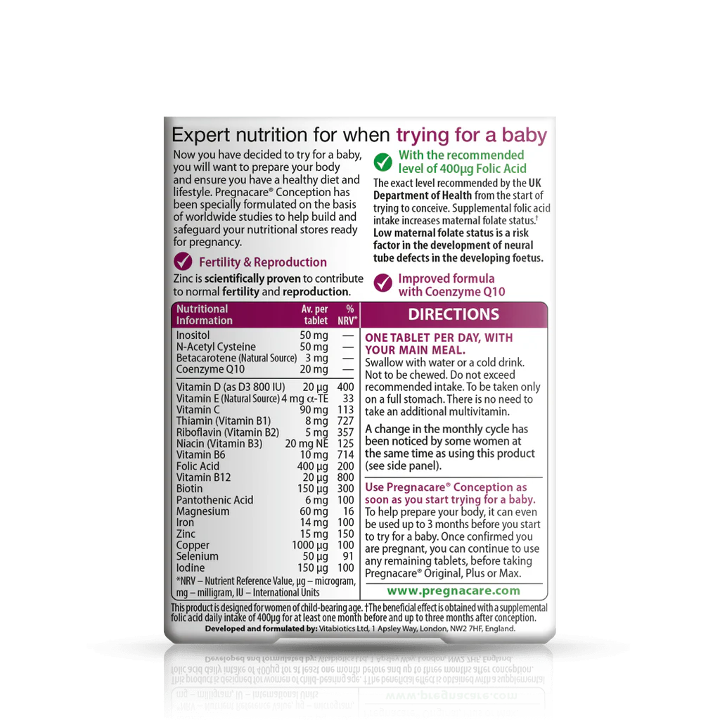 Pregnacare Conception provides a carefully balanced comprehensive formulation of micronutrients including the specific nutrients Inositol, Coenzyme Q10 , N-acetyl Cysteine and selenium. The formula also includes vitamin B12 and folic acid at 400µg, the exact level recommended by the Department of Health.